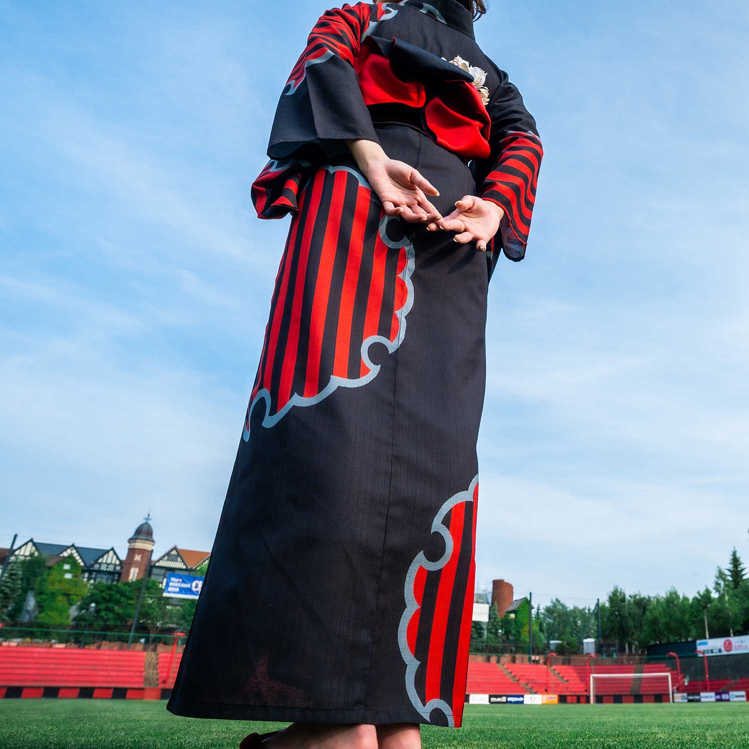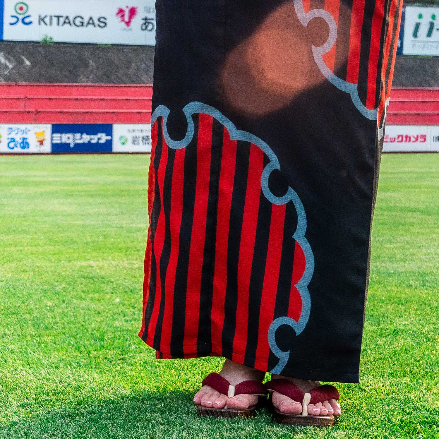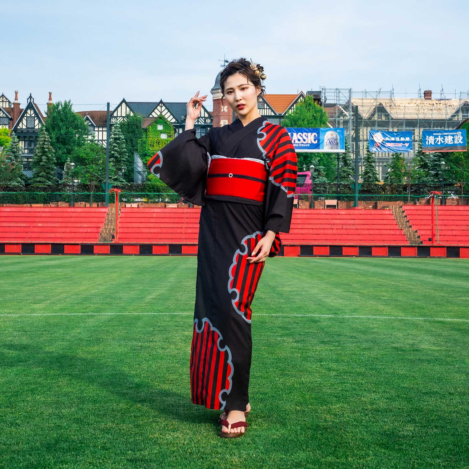 コンサドーレ札幌との特別コラボ、鮮やかな赤が印象的な浴衣です。