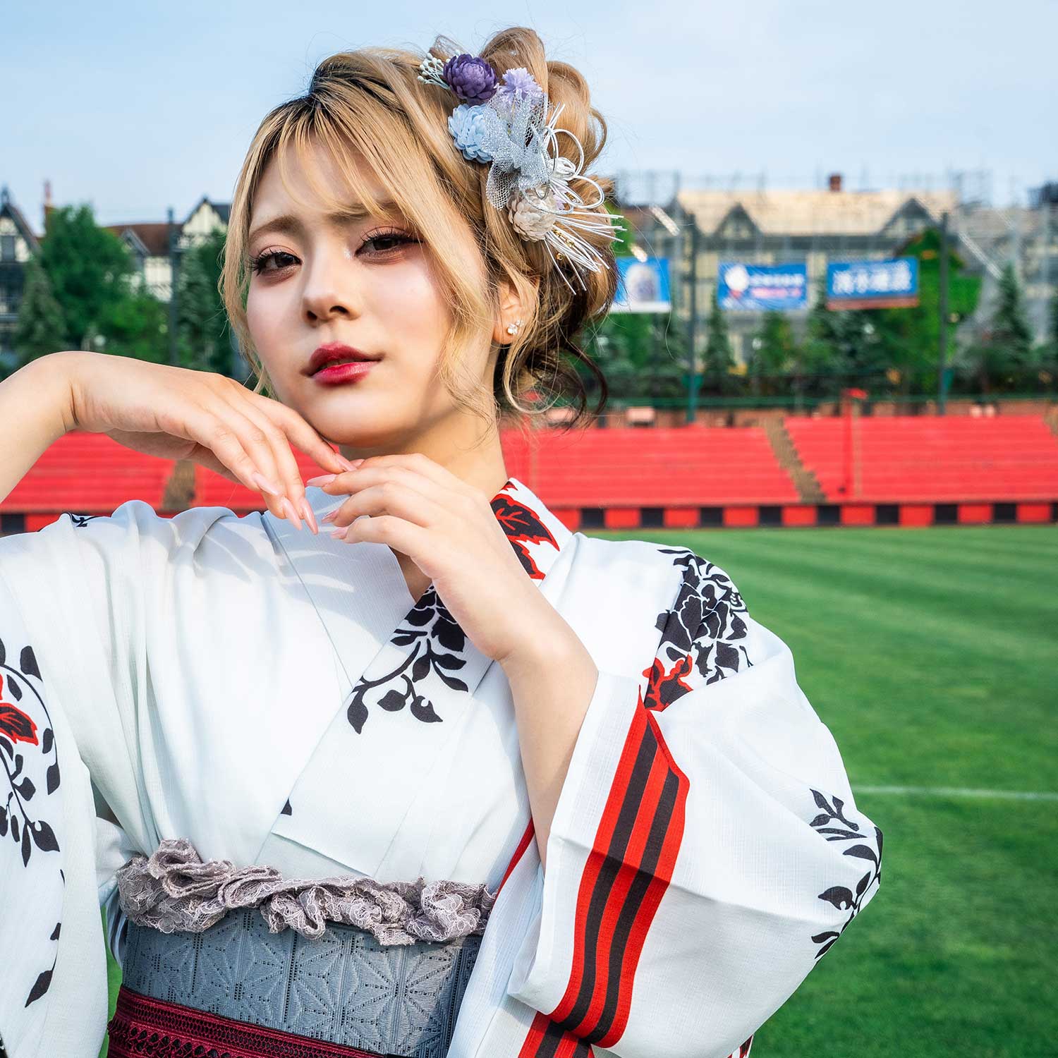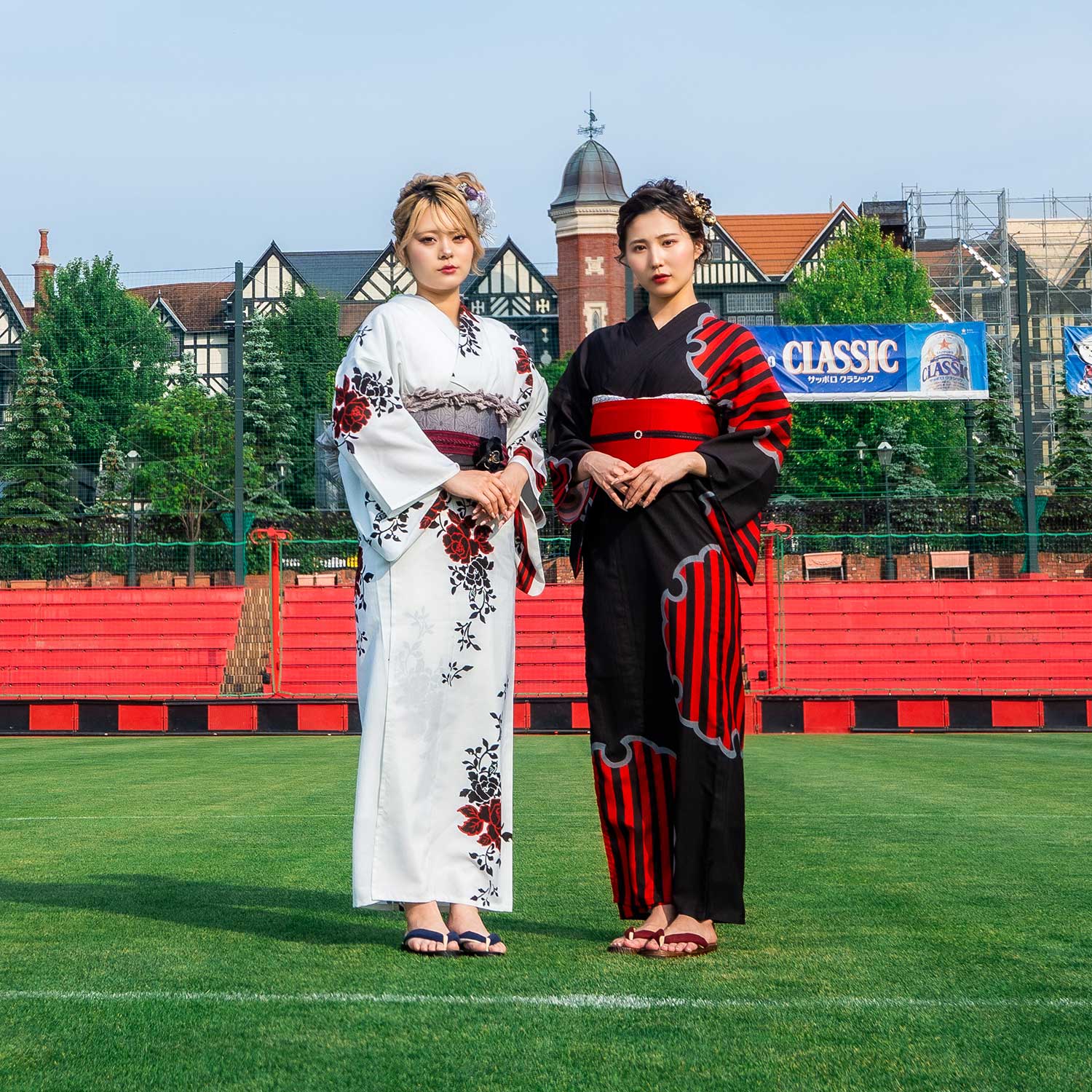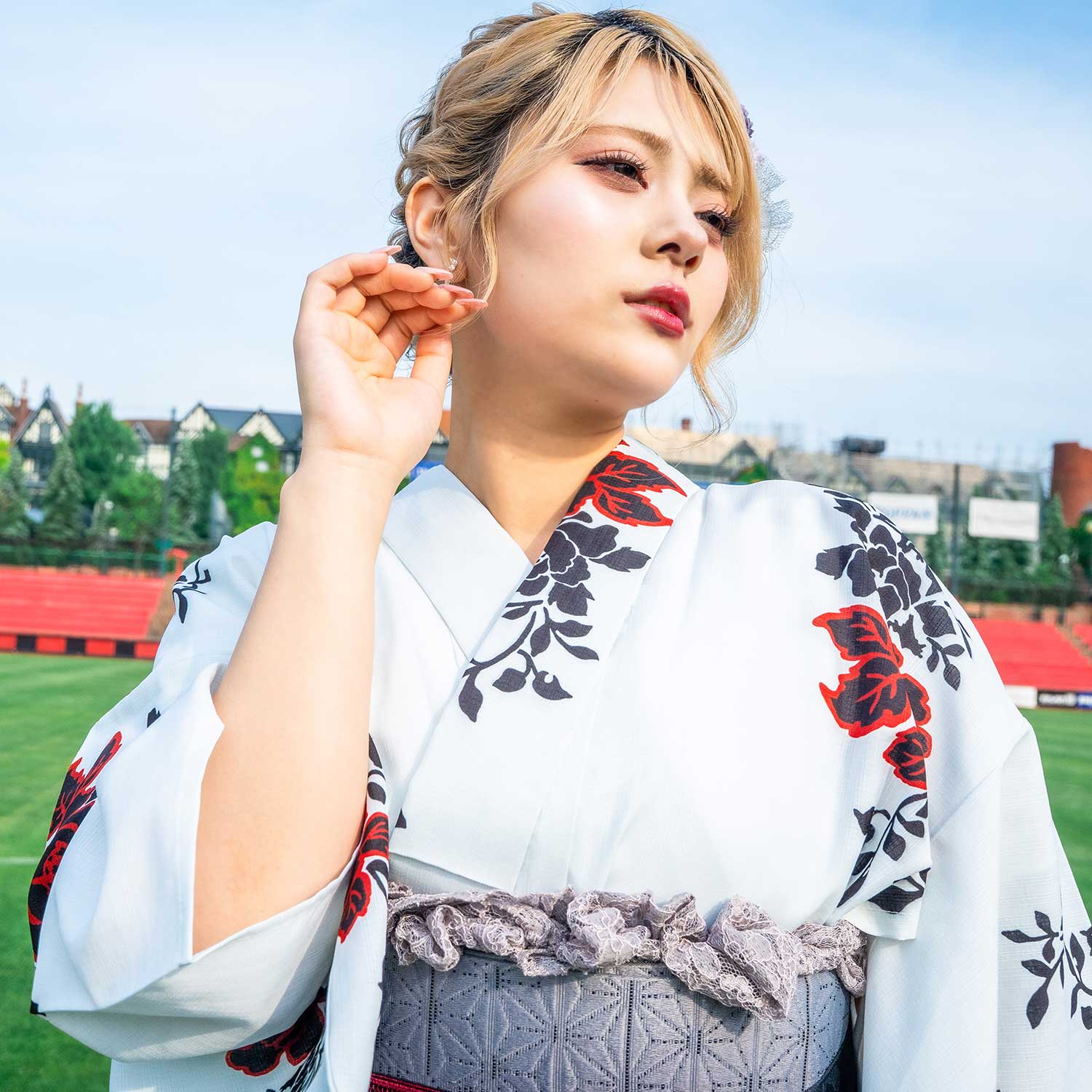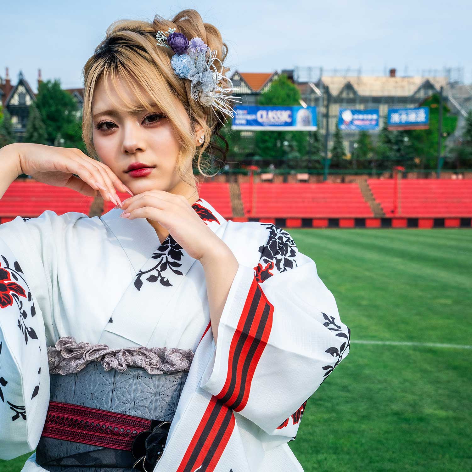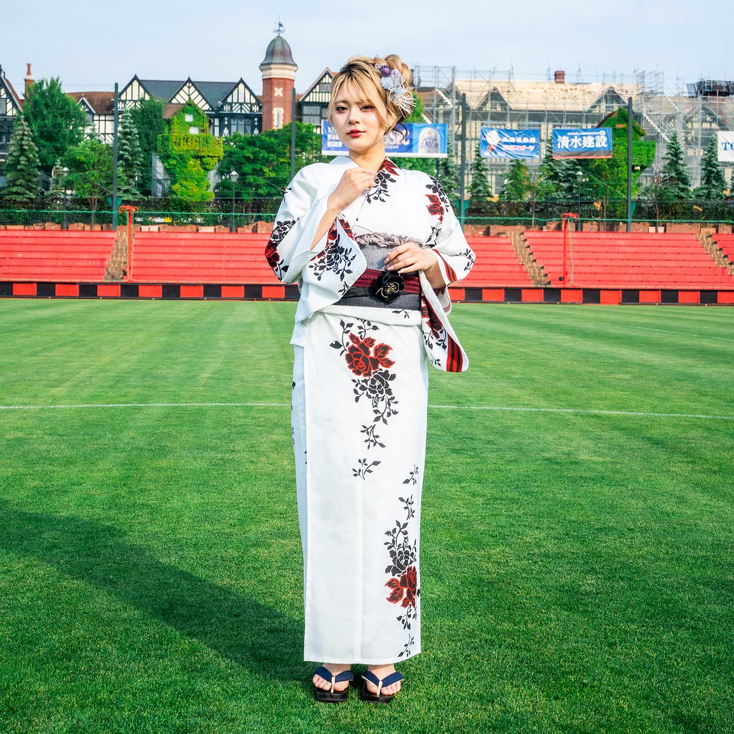 動くたびに揺れる浴衣の裾が軽やかで、光に映える清らかな白が夏の空気に映えます。コンサドーレファンとしての気持ちをさりげなく表現できるのも魅力のひとつです。